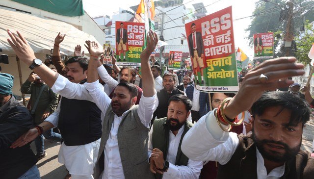 प्रदर्शन के दौरान यूथ कांग्रेस के कार्यकर्ताओं हाथों में पोस्टर-बैनर ले रखा था। इसमें मुख्य निर्वाचन आयुक्त को आरएसएस के ड्रेस में दर्शाया गया था। वहीं प्रधानमंत्री नरेंद्र मोदी और केंद्रीय गृहमंत्री अमित शाह को भी पोस्टर में शामिल किया गया था।