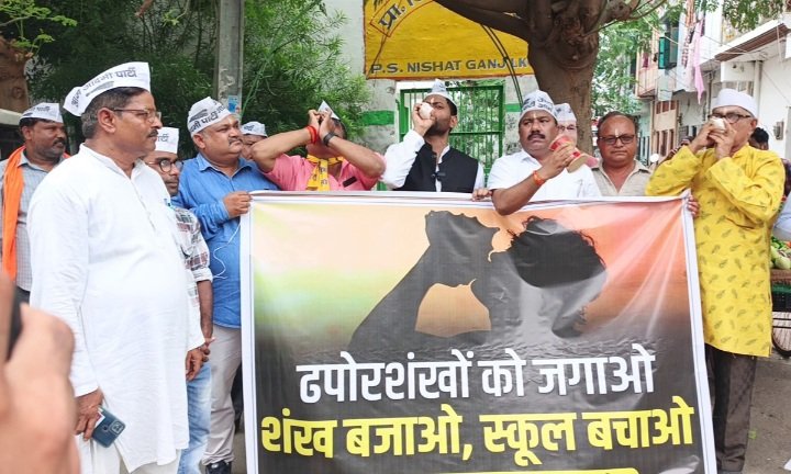 आरयू ब्यूरो, लखनऊ। यूपी में सरकारी स्कूलों को बंद किए जाने के विरोध में आज एक बार फिर आम आदमी पार्टी ने प्रदर्शन किया। आप कार्यकर्ताओं ने राज्य के सभी जिला मुख्यालयों पर योगी सरकार के खिलाफ अपना प्रदेशव्यापी ‘ढपोरशंखों को जगाओ शंख बजाओ, स्कूल बचाओ अभियान’ तेज किया है। जिसमें कई आप नेताओं ने पुलिस को गिरफ्तारी भी दी।